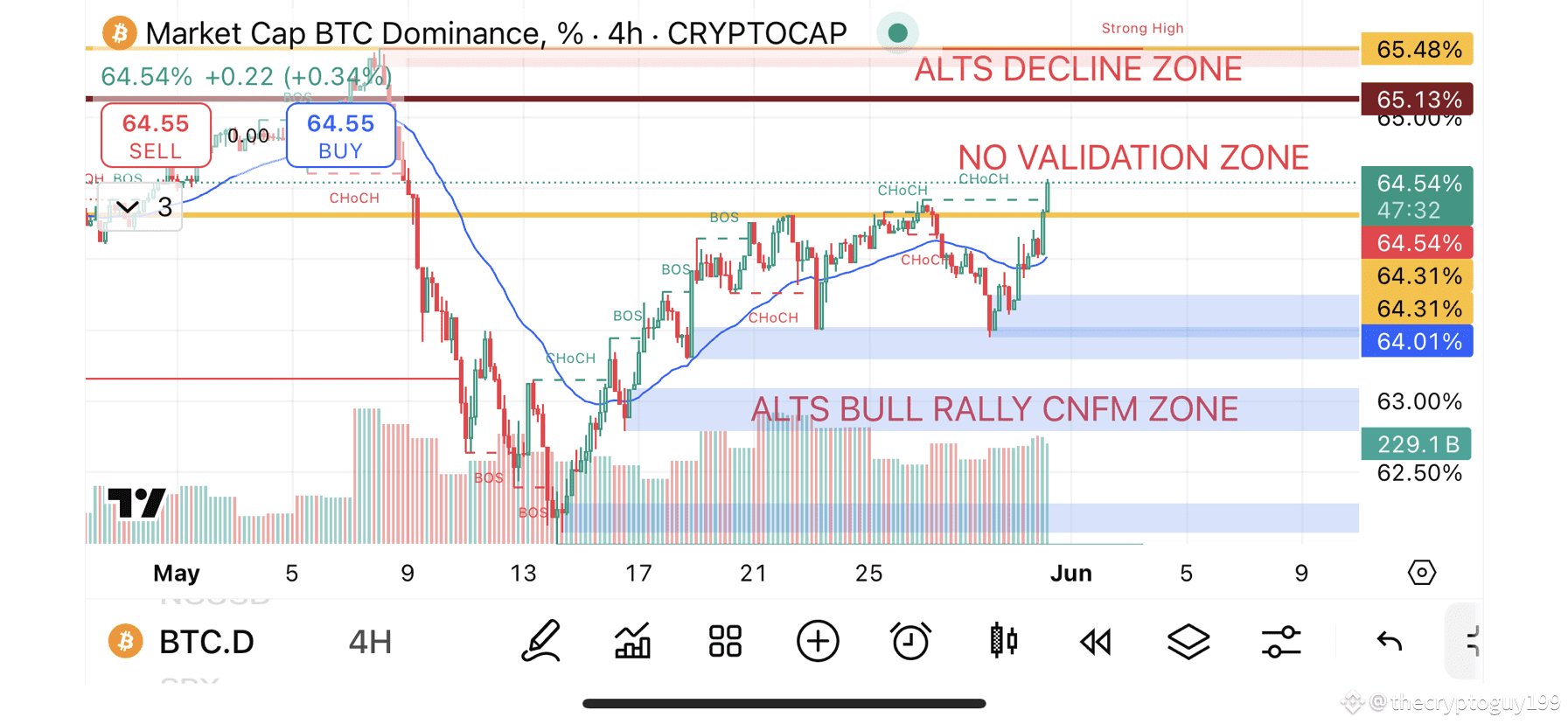 2 forti candele di 4H hanno chiuso sopra il 64.31%, rompendo la linea limite che manteneva vive le speranze del rally degli altcoin.