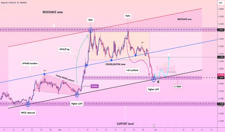Il prezzo ha perfettamente realizzato la mia ultima idea.$DOGE ha appena stampato un minimo più alto sul supporto del canale ascendente, rimbalzando dalla zona 0.188–0.190. Il precedente ritracciamento A-B-C sta svanendo e segnali rialzisti iniziali si mostrano sopra 0.192. Se i compratori riprendono il controllo, il prezzo potrebbe mirare alla resistenza di 0.215 mentre il momentum si ricostruisce. La struttura rimane rialzista finché è sopra la linea di tendenza e il blocco di supporto.