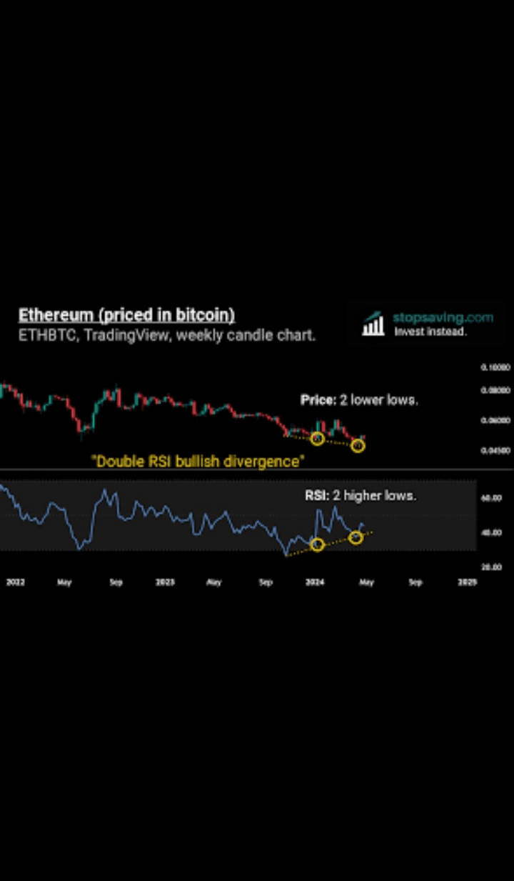 I recenti modelli grafici sulla coppia ETH/BTC indicano una rottura da una fase di consolidamento. La coppia ha formato un minimo più alto e sta testando livelli di resistenza chiave. Indicatori tecnici come l'RSI (Indice di Forza Relativa) stanno tendendo verso l'alto senza entrare in territorio di ipercomprato, segnalando forza senza eccessiva pressione d'acquisto.