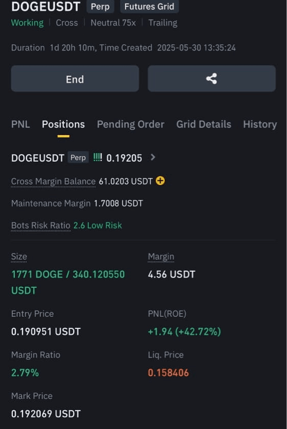 La correzione del mercato DOGE coincideva perfettamente con il caos geomagnetico della Terra. La dimensione della posizione del mio bot è esplosa da 1.771 DOGE a 2.428 DOGE mentre comprava sistematicamente ogni ribasso secondo la sua strategia di bot a griglia. Mentre affrontavo interruzioni di energia, il mio bot stava raddoppiando la sua convinzione a lungo termine nel DOGE.