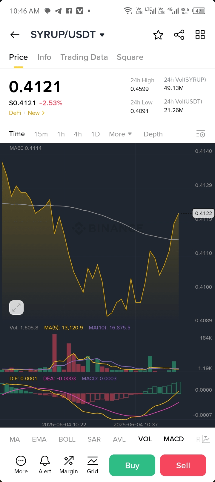 2. MA60 (linea grigia): $0.4114 – il prezzo attuale l'ha appena superata, leggero segnale rialzista.