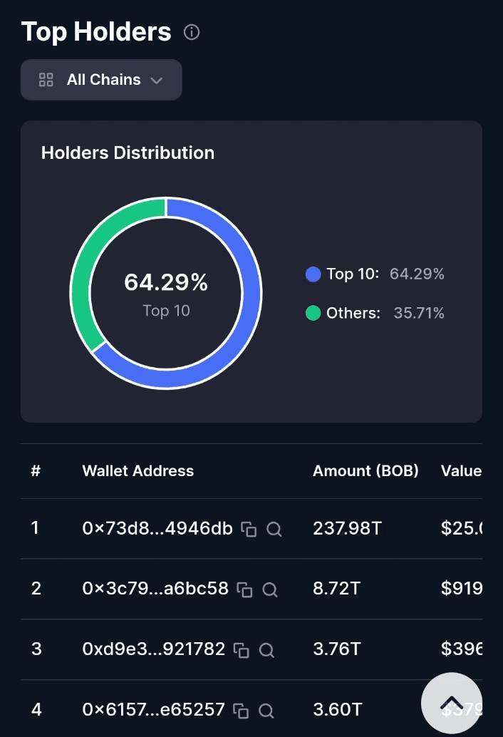 I dati mostrano che il 64,29% di $BOB è detenuto dalle prime 10 wallet. Una sola wallet controlla oltre 237 trilioni di token $BOB. Questo livello di concentrazione dà un enorme potere a un ristretto numero di detentori, che potrebbero far crollare il mercato in pochi secondi.