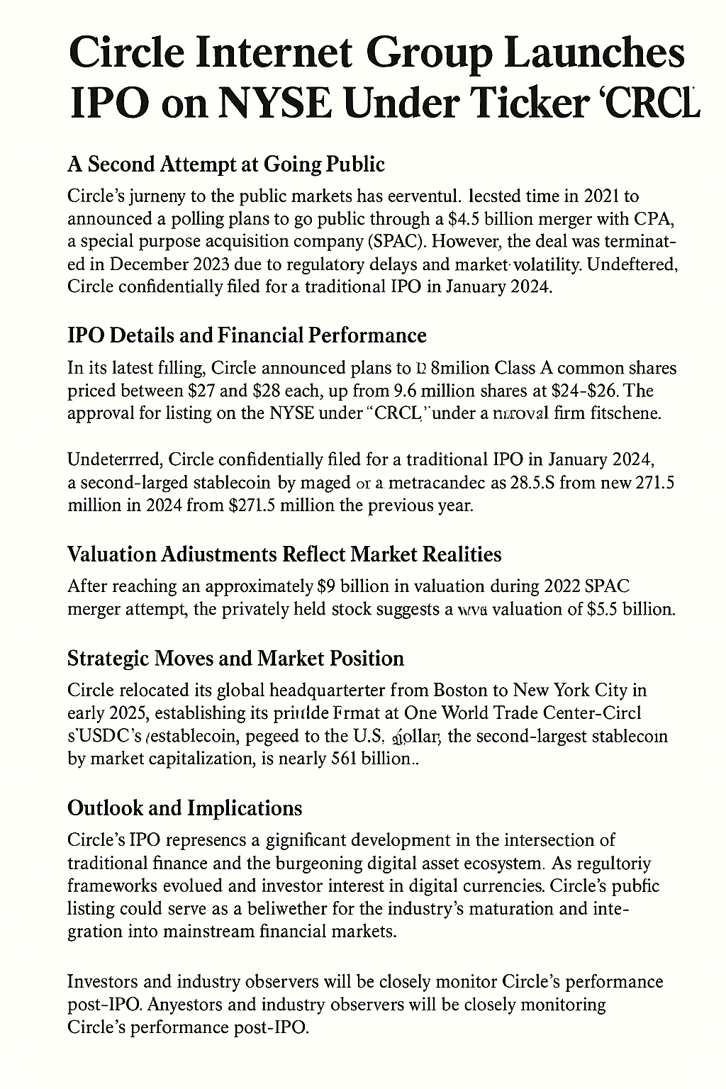 Nella sua ultima registrazione, Circle ha annunciato piani per offrire 12,8 milioni di azioni comuni di Classe A a un prezzo compreso tra 27 e 28 dollari ciascuna, un aumento rispetto al piano precedente di 9,6 milioni di azioni a un prezzo compreso tra 24 e 26 dollari. Inoltre, il numero di azioni offerte dai venditori azionisti è aumentato da 14,4 milioni a 19,2 milioni. La società ha ricevuto approvazione per quotarsi sulla Borsa di New York con il simbolo ticker "CRCL."