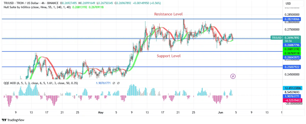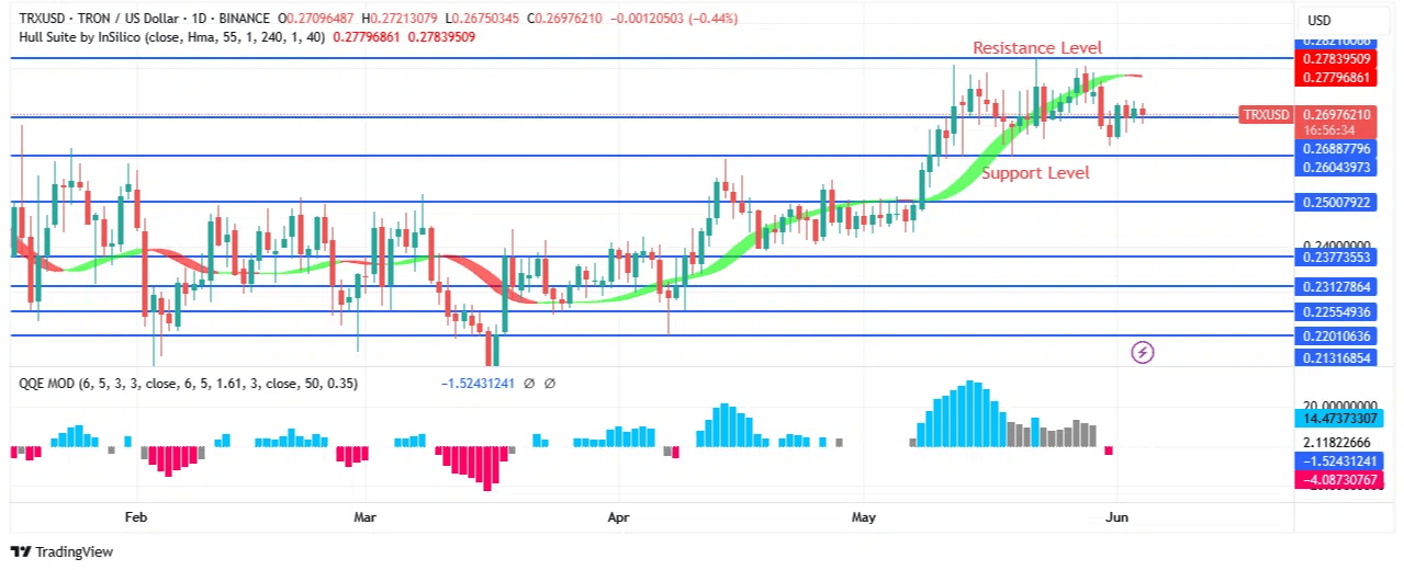 Il prezzo si ritira al punto $0.28 Analisi del prezzo di TRON – 04 Giugno Se la tendenza di acquisto continua sopra $0.26, il prezzo di TRON potrebbe essere pronto a superare le barriere di $0.29 e $0.30. Se il prezzo rimane sotto $0.26, potrebbe avvicinarsi agli script di $0.25 e $0.23.