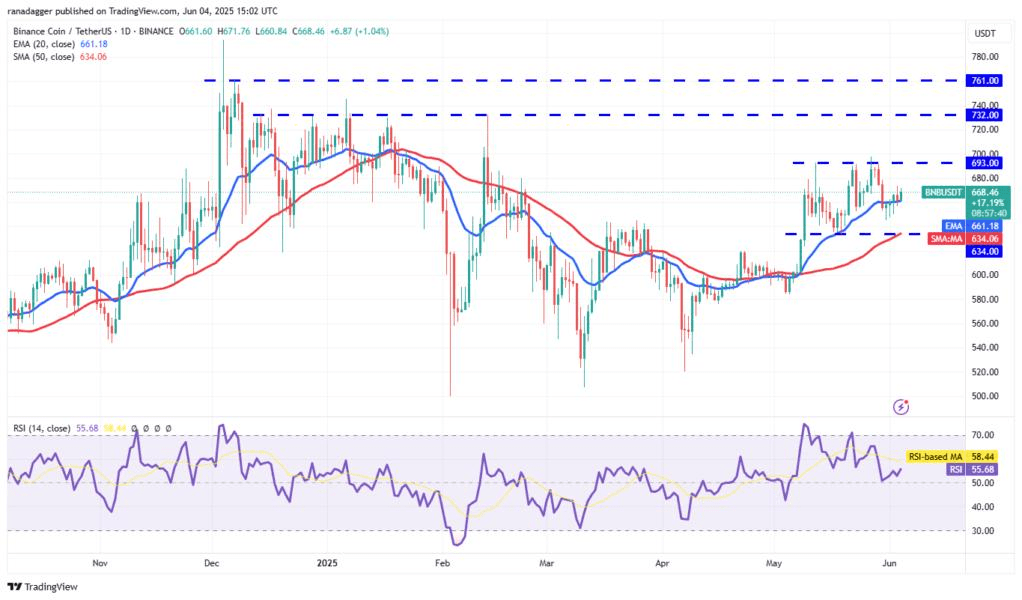 BNB (BNB) è aumentato e ha chiuso sopra l'EMA a 20 giorni ($661) il 1° giugno. I venditori hanno cercato di riportare il prezzo sotto l'EMA a 20 giorni il 3 giugno, ma i tori hanno difeso con successo il livello.