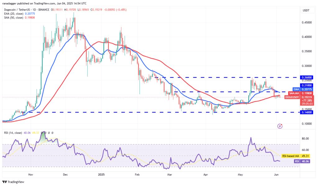 Dogecoin (DOGE) si è aggrappato alla media mobile semplice a 50 giorni ($0.19), indicando una mancanza di vendite aggressive a livelli inferiori.