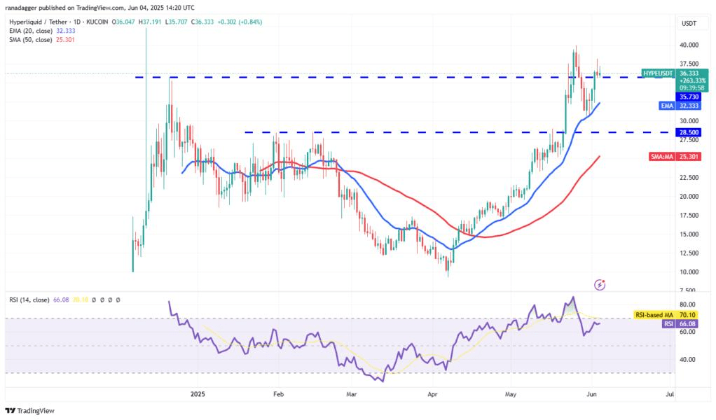 I venditori hanno cercato di riportare il prezzo sotto $35.73 il 3 giugno, ma i tori hanno mantenuto la loro posizione. Gli acquirenti cercheranno di spingere il prezzo sopra $40, sfidando la forte resistenza a $42.50. Se il livello di $42.50 viene superato, la coppia HYPE/USDT potrebbe volare a $50.