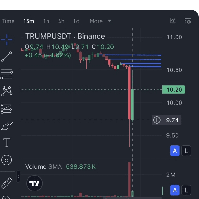 Dopo un forte sell-off, $TRUMP è rimbalzato in modo impressionante, attualmente scambiato vicino a $10.20 con un guadagno del +4.62%. La lunga candela sull'ultima candela evidenzia un'intensa volatilità, mentre i tori stanno cercando di riprendere il controllo della tendenza.