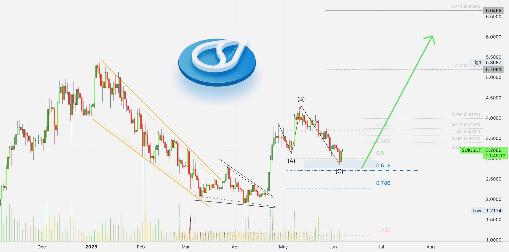 Dopo un ritracciamento di 24 giorni — quasi lungo quanto il precedente rally di 35 giorni — SUI è rimbalzato forte dal ritracciamento di Fib 0.5, con 0.618 intatto. Questo è un doppio segnale rialzista.