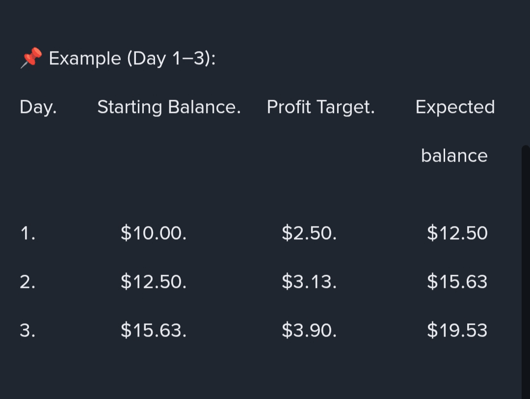 Questa ĆØ una strategia di gestione del denaro strutturata progettata per far crescere un piccolo conto di trading utilizzando obiettivi di profitto giornalieri costanti e il potere dell'interesse composto.
