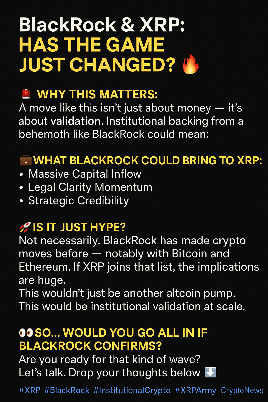 Immagina questo: il più grande gestore di asset al mondo, BlackRock, che entra nell'arena XRP. Non è solo una notizia — è un segnale sismico per istituzioni, investitori e regolatori.