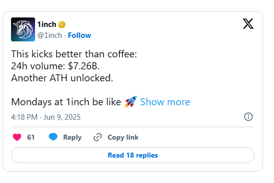 1inch, una delle principali piattaforme di trading DeFi, ha appena stabilito un nuovo record storico nel volume di trading giornaliero.
