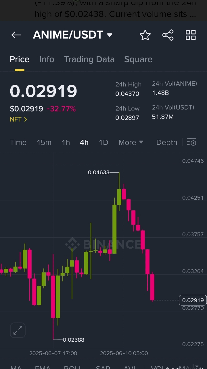 $ANIME /USDT sta attualmente negoziando a $0.02919 (-32.77%), dopo un forte calo dal suo massimo di 24 ore di $0.04633. L'intervallo di prezzo delle 24 ore si colloca tra $0.02897 – $0.04633, con un volume di scambi che resta forte a $51.87M USDT, indicando un interesse continuo nonostante la vendita.