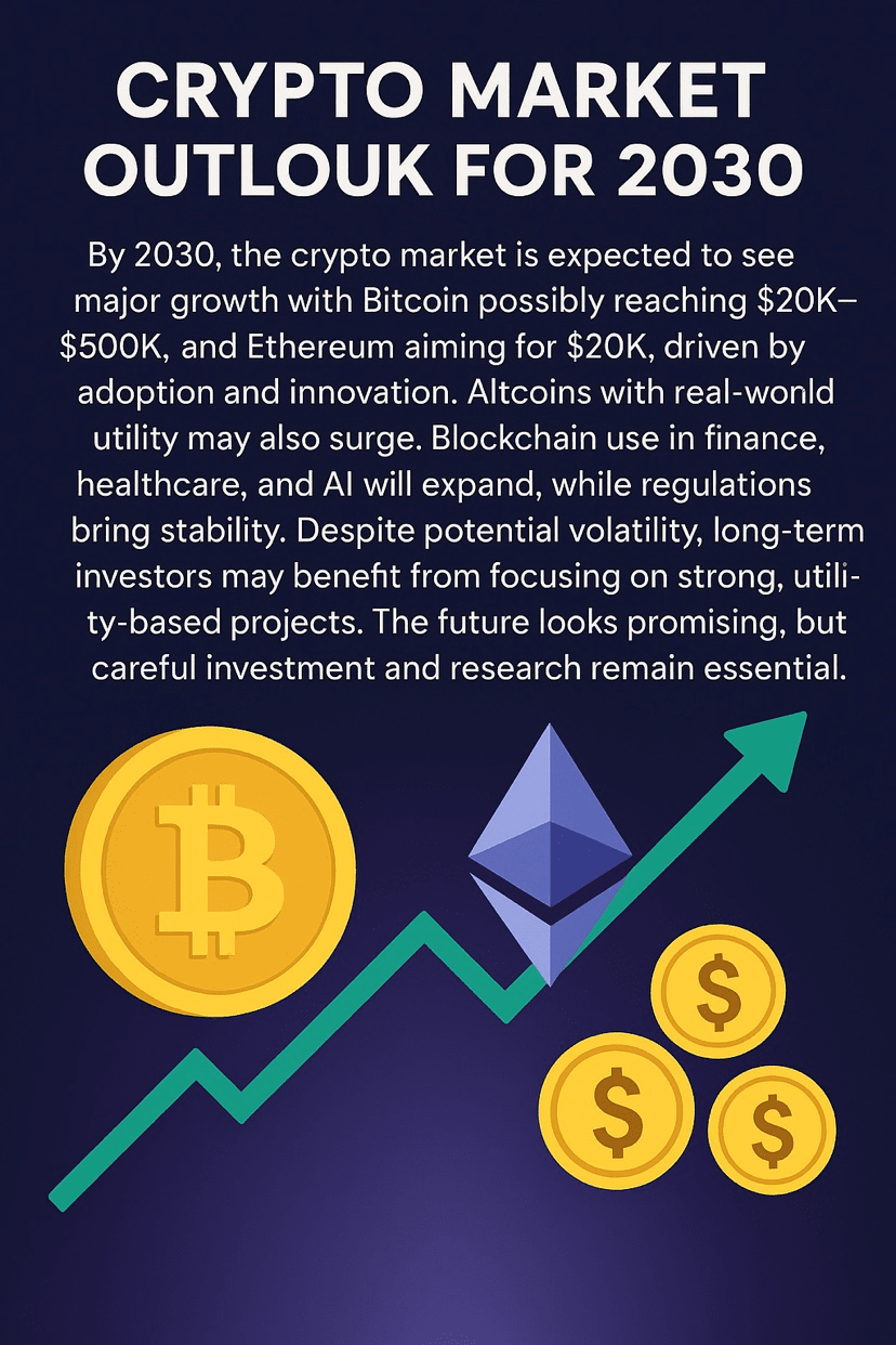 Entro il 2030, si prevede che il mercato delle criptovalute vedrà una crescita significativa con $BTC possibilmente raggiungendo $200K–$500K, e $ETH puntando a $20K, guidato da adozione e innovazione. Gli altcoin con utilità reale potrebbero anche aumentare. L'uso della blockchain in finanza, sanità e IA si espanderà, mentre le regolamentazioni porteranno stabilità. Nonostante la potenziale volatilità, gli investitori a lungo termine potrebbero beneficiare concentrandosi su progetti solidi e basati sull'utilità. Il futuro sembra promettente, ma un investimento e una ricerca attenta rimangono essenziali.#btc200k