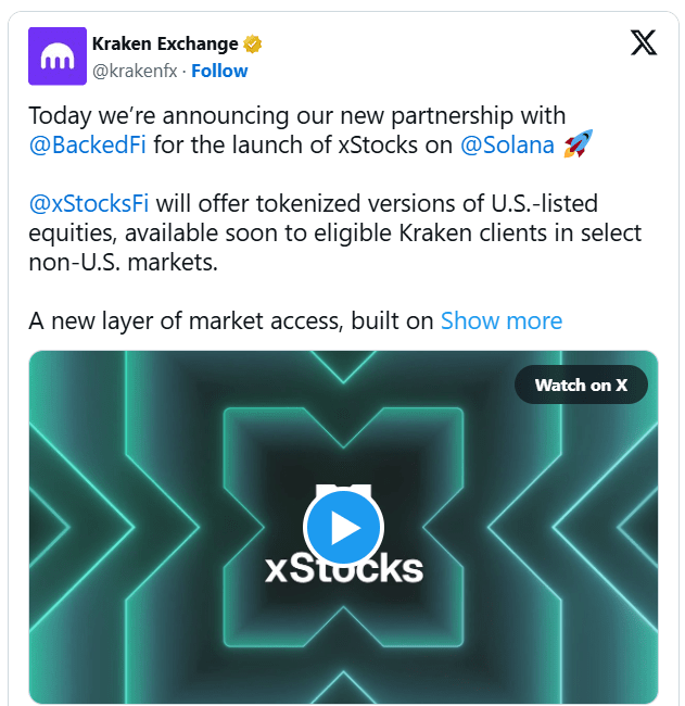 Kraken sta lanciando xStocks — versioni tokenizzate di popolari azioni statunitensi come Apple, Nvidia e Tesla — mescolando crypto con finanza tradizionale nella sempre crescente sfera degli asset del mondo reale (RWA) che arrivano alla blockchain.