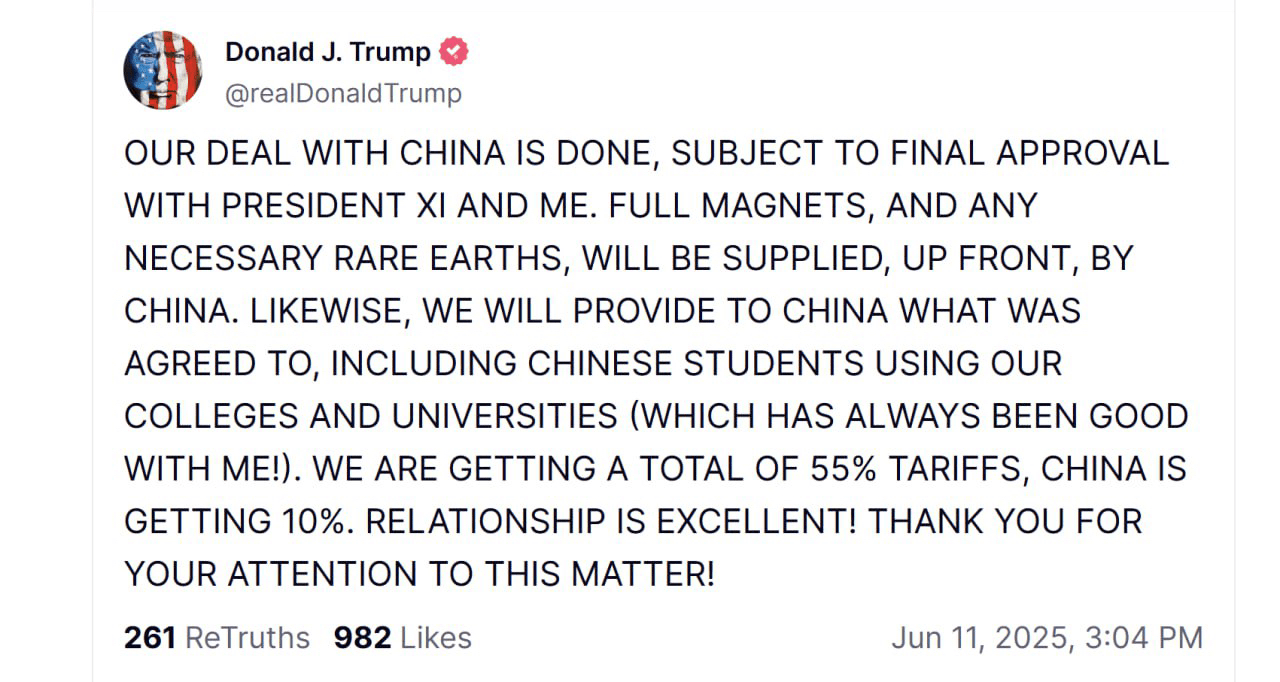 Il presidente degli Stati Uniti Donald Trump ha dichiarato che è stato raggiunto un accordo preliminare con la Cina su questioni chiave, tra cui la fornitura di terre rare e magneti. Tuttavia, l'accordo finale richiede l'approvazione sia da parte di Trump che del leader cinese Xi Jinping.