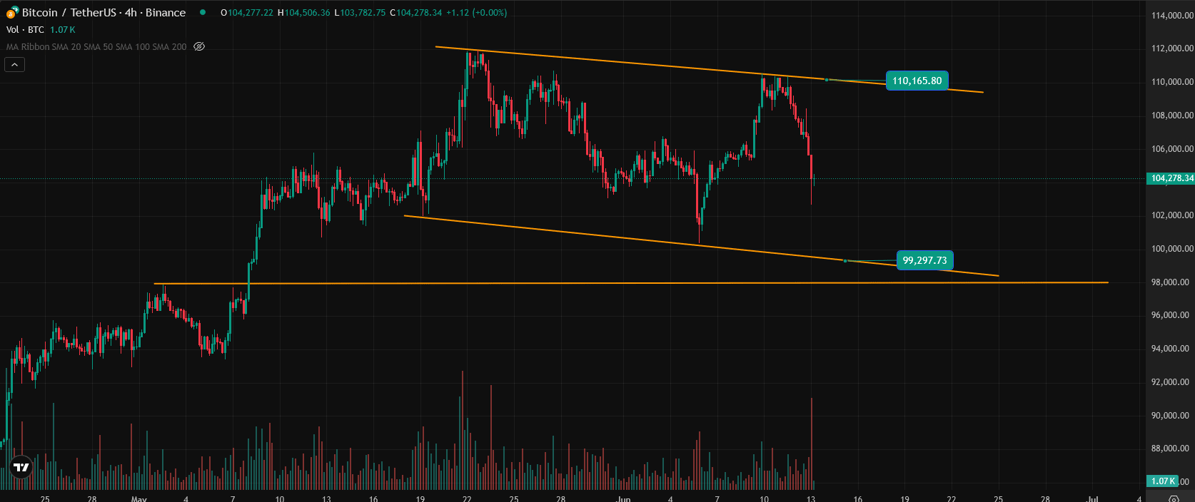 Il 9 giugno, BTC è balzato al picco attuale di $110,618. Poi, il 10 giugno, è apparsa una stella incrociata, e gli acquirenti non erano così aggressivi. L'11 giugno, abbiamo visto una stella serale irregolare. Entro 1 ora dopo l'annuncio di questa guerra il 12 giugno, il prezzo di BTC è sceso come una cascata.