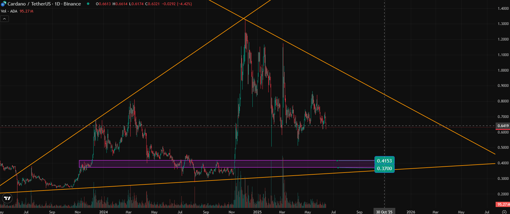 Ha un forte intervallo di supporto dei prezzi, che è di circa $0.4 e $0.35. Vale a dire, ADA potrebbe tornare al prezzo più basso dell'inizio dell'anno scorso, e poi in generale il prezzo avrà bisogno di essere sistemato per un po' prima di intraprendere qualsiasi azione. Se ADA segue il percorso che ho menzionato, allora questo tempo potrebbe essere più lungo, anche per diversi mesi.