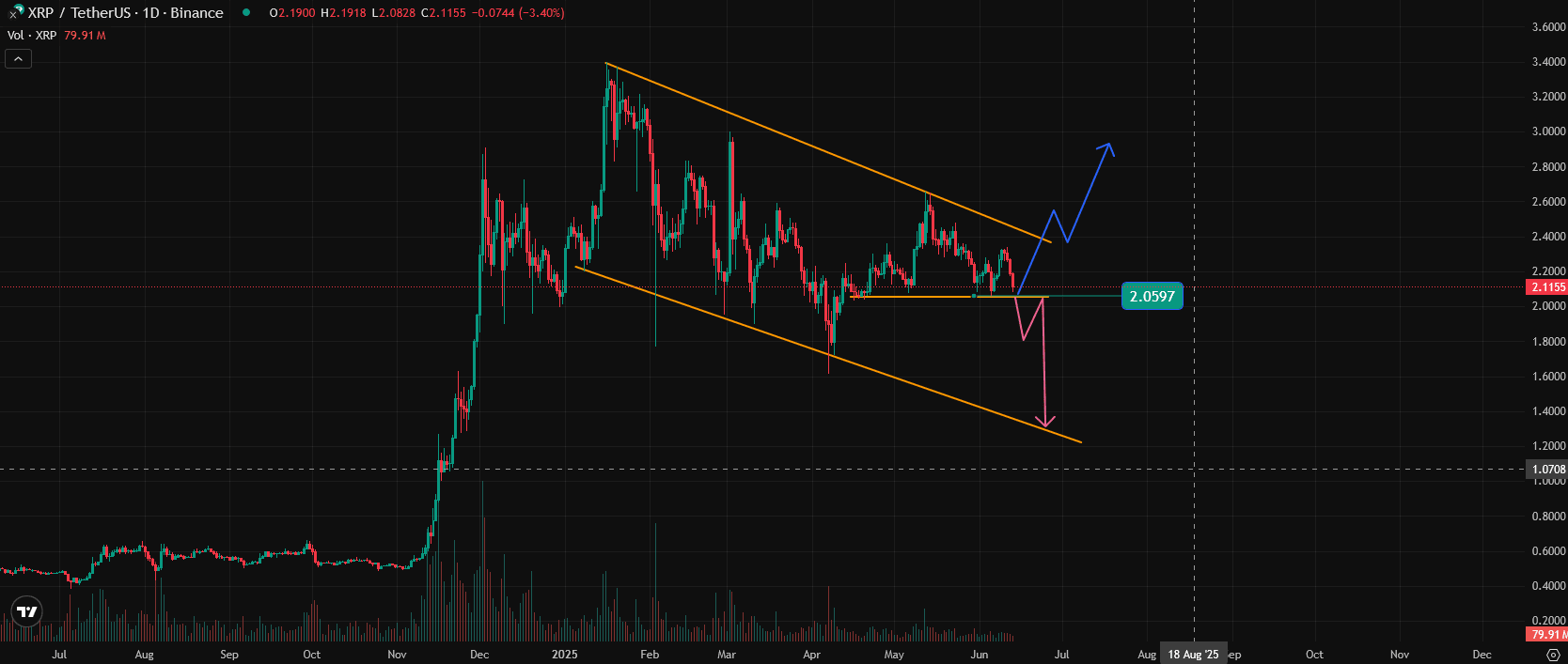 Ho contrassegnato due percorsi di colore diverso nella figura e il forte prezzo di supporto che sostiene XRP in questo momento.