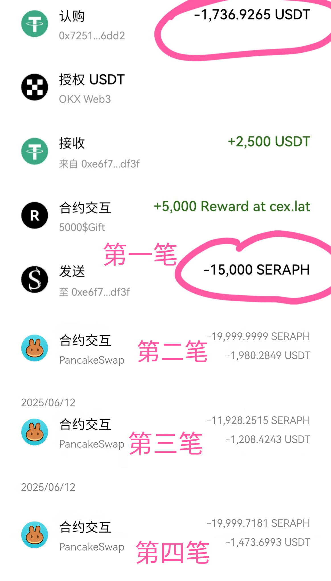 📍Ho aggiunto liquidità e messo in staking 4 volte tra le 11:00 e le 16:00 del 12 giugno, per un totale di 67000 token SERAPH e 6400 USDT aggiunti e messi in staking.