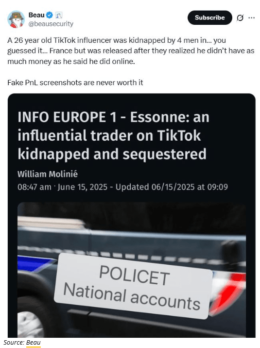 Un trader di criptovalute che crea contenuti su TikTok è stato rapito in Francia venerdì ed è stato rilasciato il giorno successivo quando i suoi rapitori hanno scoperto che non aveva fondi sufficienti per coprire le loro richieste di estorsione.