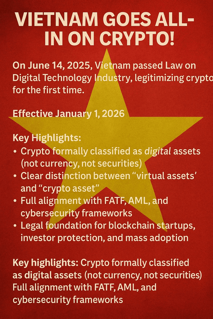 📅 Efficace dal 1 gennaio 2026 — gli attivi cripto in Vietnam avranno uno stato legale chiaro e riconosciuto. Niente più aree grigie. Il Vietnam sta inviando un messaggio globale: questo mercato è pronto per una scala seria.