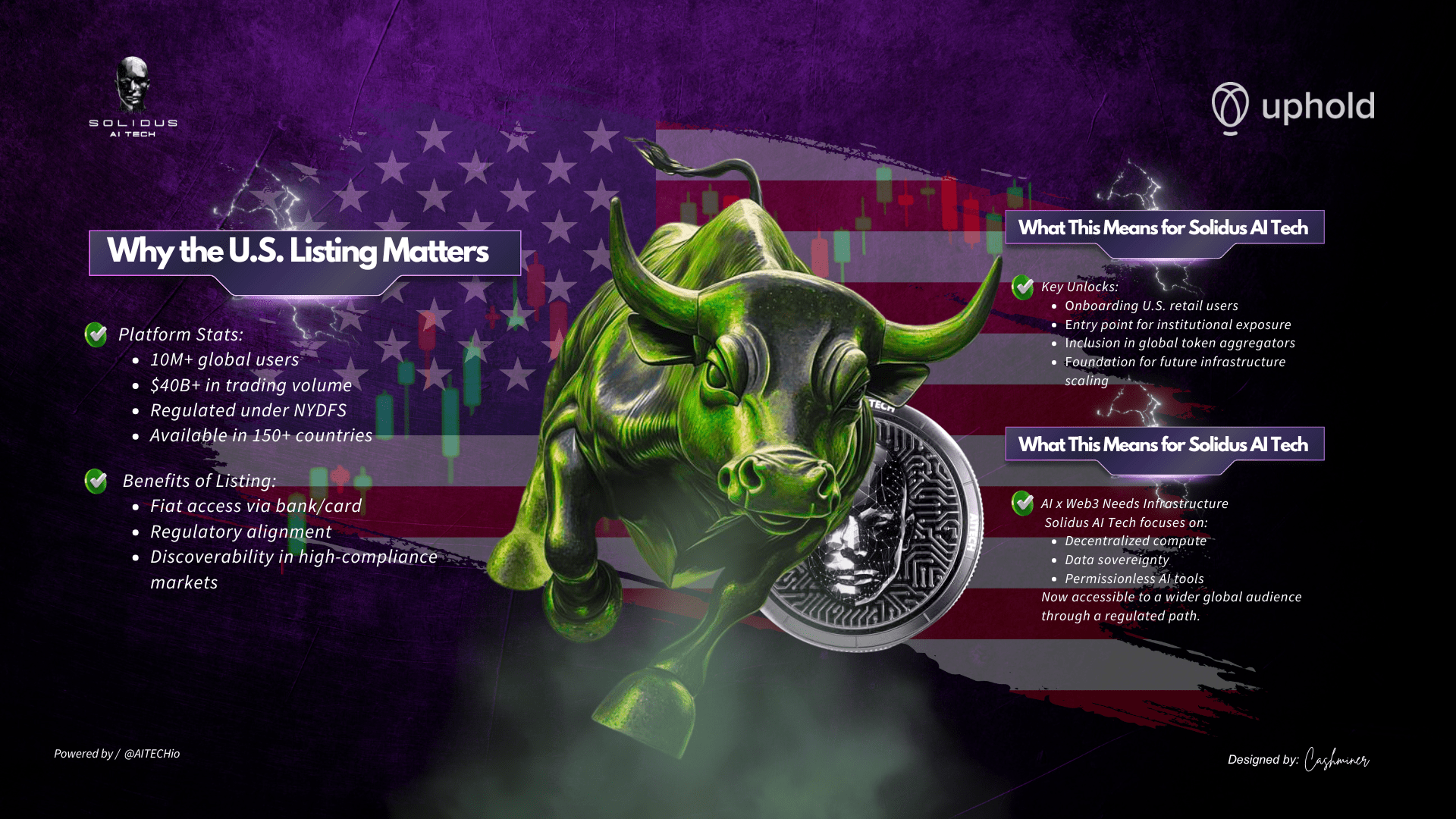 Solidus AI Tech ha compiuto un significativo passo avanti con la sua recente quotazione su una delle piattaforme di trading di asset digitali più affermate degli Stati Uniti. Con oltre 10 milioni di utenti, oltre 40 miliardi di dollari di volume complessivo e presenza in oltre 150 paesi, questa mossa posiziona AITECH all'incrocio tra accessibilità globale e allineamento normativo statunitense.