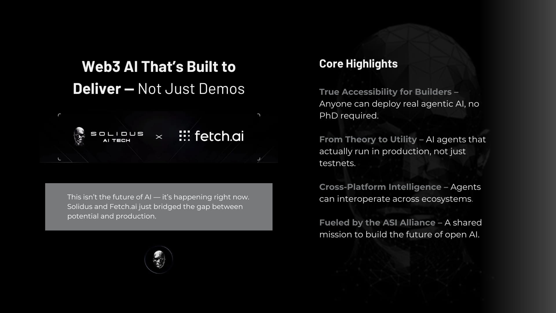 Come potrebbe apparire una futura collaborazione tra Solidus e Fetch.ai? Questo sembra essere la fase uno di una storia molto più grande. Anticipo co-implementazioni di sistemi multi-agente, dove le menti di ASI‑One alimentano applicazioni di Agentverse e flussi di lavoro costruiti con AgentForge fianco a fianco. Pool di calcolo condivisi e interoperabilità tra agenti nei marketplace potrebbero consentire agli agenti di migrare senza soluzione di continuità tra il centro HPC ecologico europeo di Solidus e la rete di Fetch.ai. Immagina pipeline di IA che iniziano su una piattaforma, trasferiscono compiti a un'altra e restituiscono risultati, tutto in modo fidato e senza la supervisione umana. Questo è il percorso che l'ASI Alliance ci sta guidando.