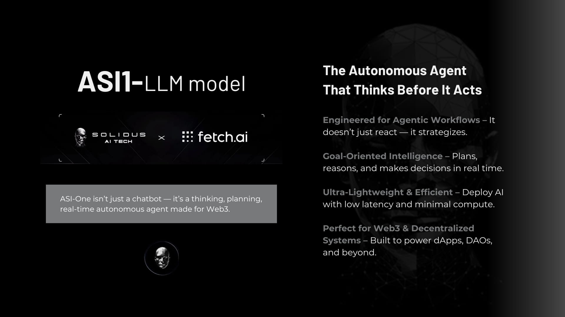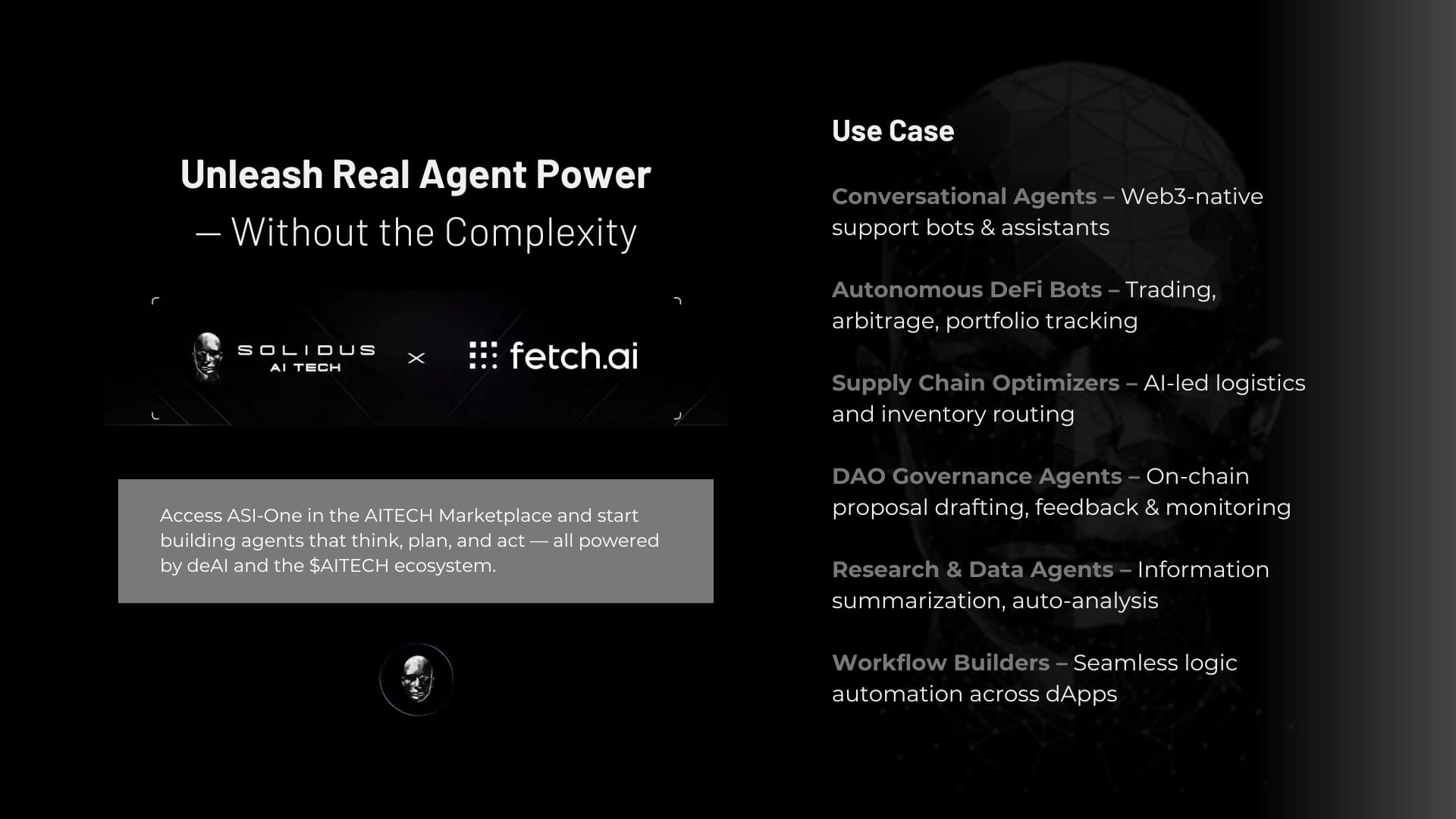 Successivamente, come beneficia questa integrazione gli utenti del AITECH AI Marketplace? Con ASI‑One attivo nel marketplace, ottieni accesso plug-and-play a un motore di intelligenza proattivo. Puoi collegarlo direttamente tramite API o inserirlo in #AgentForge - il costruttore di agenti no-code/low-code di Solidus - e iniziare immediatamente a progettare agenti che eseguono la tua strategia. Che tu abbia bisogno di un bot di trading che percepisca le flessioni del mercato e riequilibri il tuo portafoglio, un agente di supporto clienti che risolva ticket da cima a fondo, un coordinatore logistico che ottimizzi i flussi di approvvigionamento, o un assistente alla governance che pesi i dati delle proposte e esprima voti, ASI‑One si occupa del lavoro pesante per te.