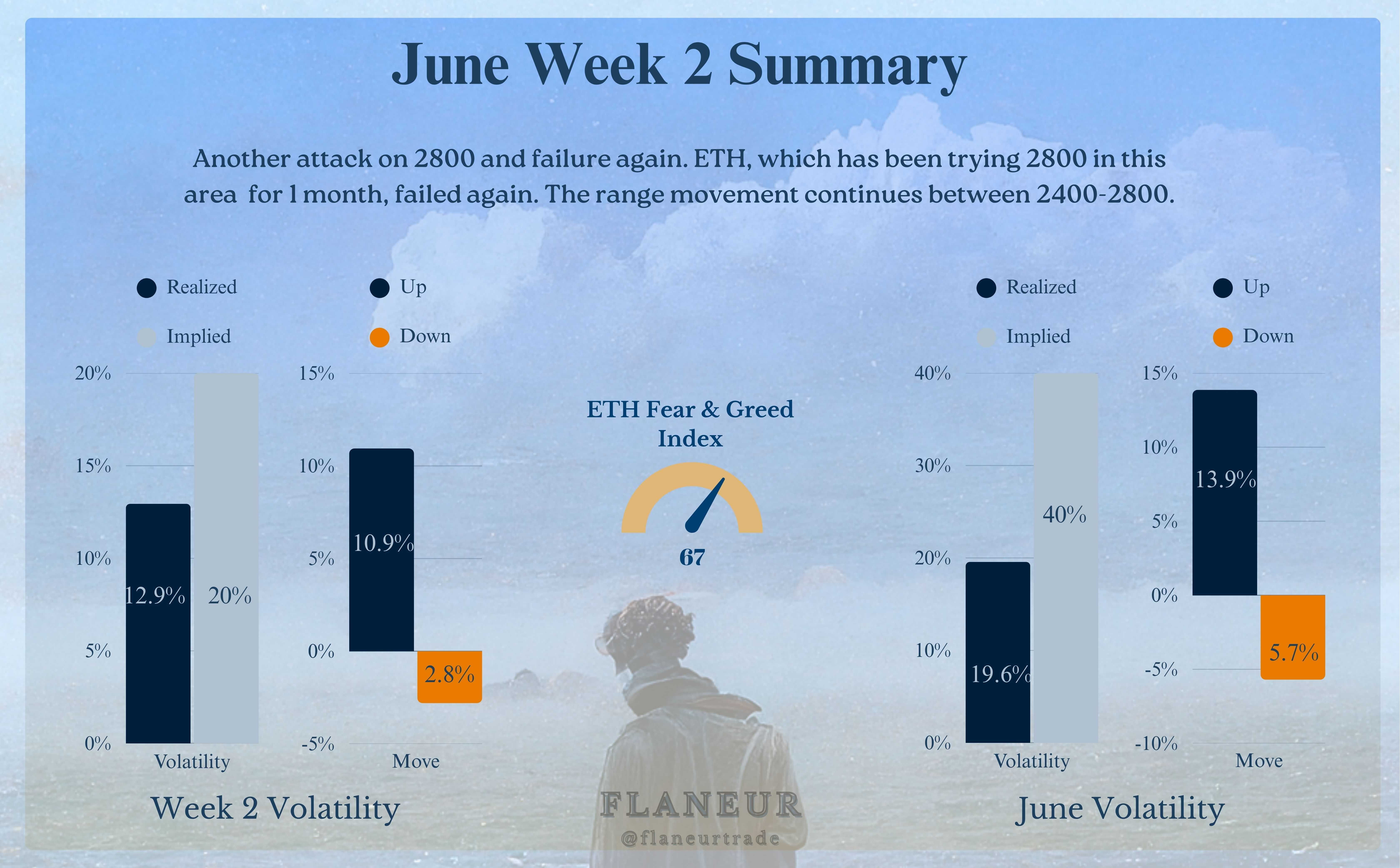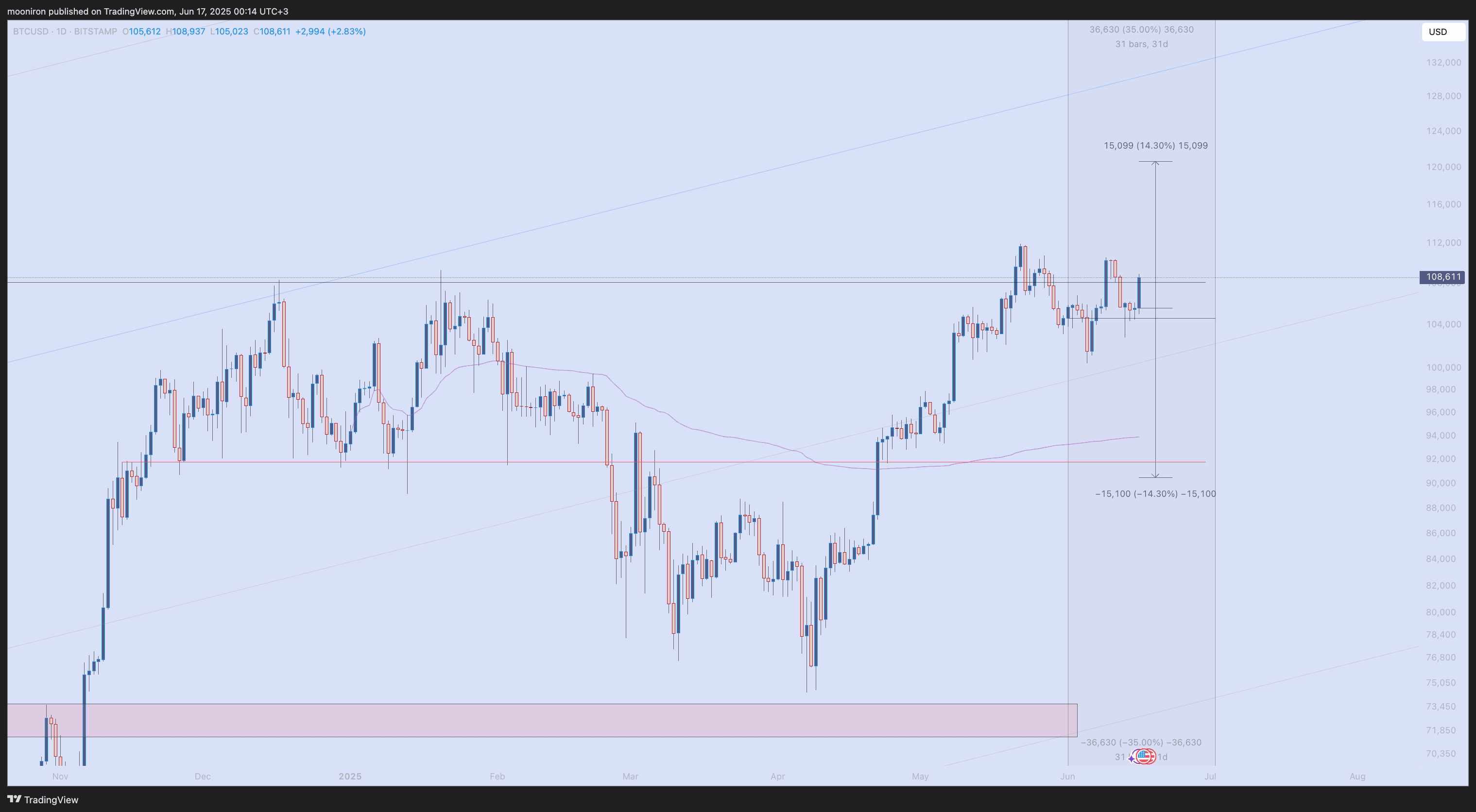 Sebbene mi aspetto un nuovo ATH questa settimana, la mia aspettativa per un ATH entro questo mese continua a causa dei rischi previsti. Credo che continuerà i suoi movimenti altalenanti all'interno di questo intervallo fino alla prima settimana di luglio. Pertanto, non prevedo movimenti estremi al rialzo o al ribasso. L'intervallo di volatilità implicita di questa settimana è compreso tra $90k e $121k. Sul grafico mensile, i massimi e minimi delle settimane precedenti non sono ancora stati superati.