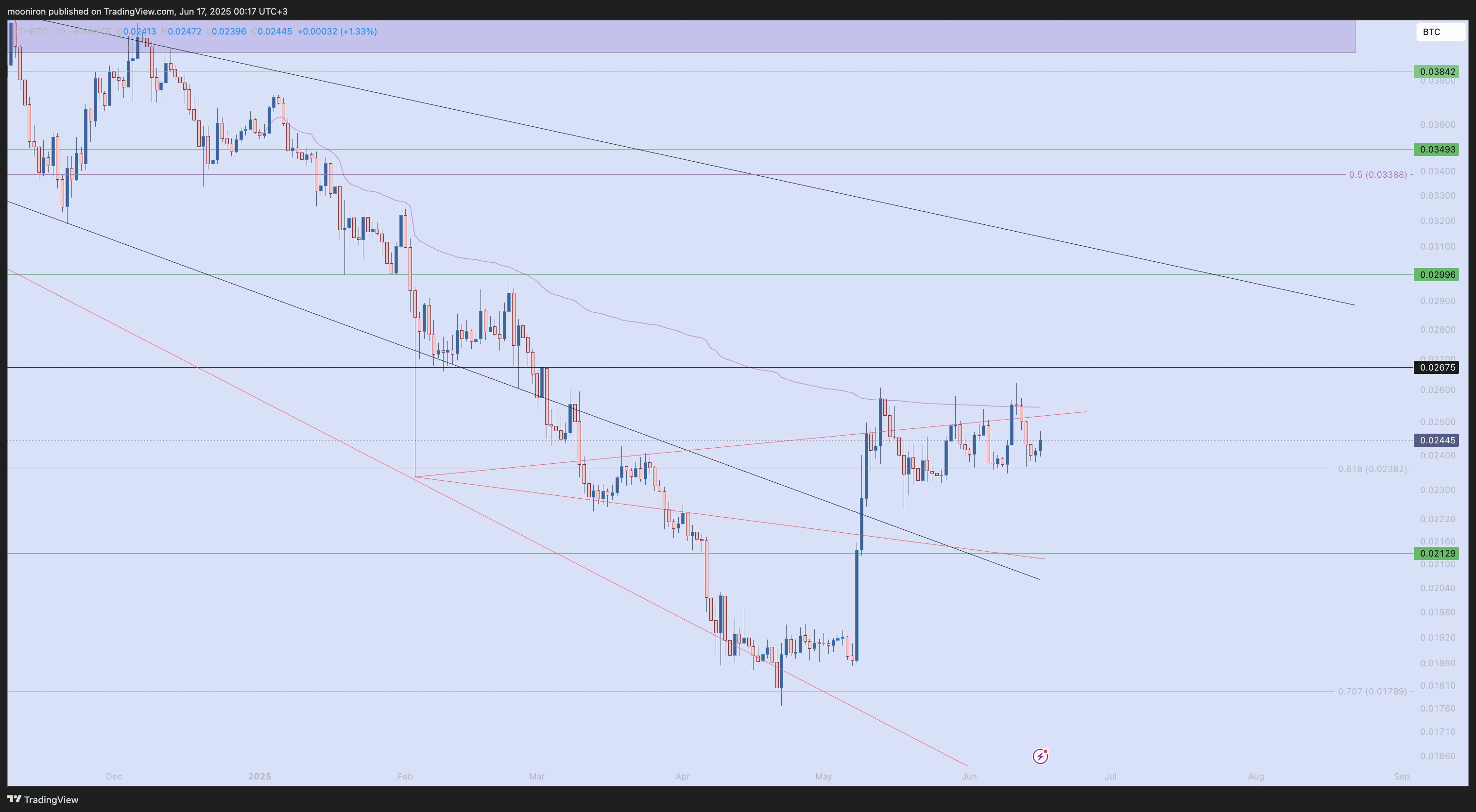 Niente è cambiato qui; continua a fare massimi più bassi e minimi più alti. Non penso sia necessario correre rischi fino a quando non si verifica una rottura. Da una prospettiva di High Time Frame (HTF), un movimento a 0.030 seguito da un retest di 0.027 potrebbe offrire un buon punto d'ingresso. Un mantenimento sostenuto sopra 0.026 potrebbe anche essere tradato per un movimento verso 0.030.