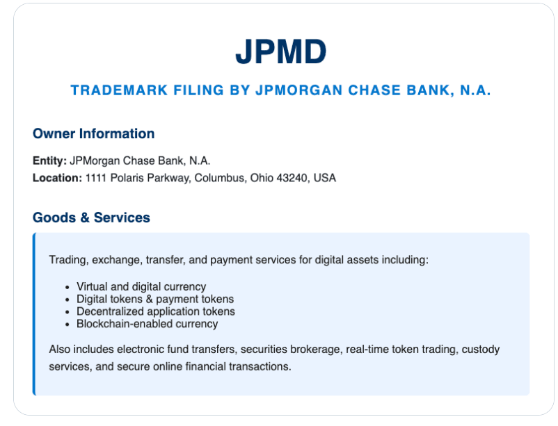 Secondo il sito web dell'USPTO, JPMorganChase ha presentato la domanda il 15 giugno. Tra le altre categorie relative alle criptovalute e alla tecnologia blockchain, la domanda menzionava "JPMD" come un bene o servizio che offrirebbe "servizi di trading, scambio, trasferimento e pagamento per asset crittografici."