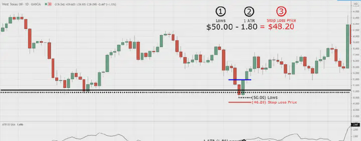 (3) Sottrai il valore attuale di ATR dal prezzo di supporto più basso - questo è il tuo punto di stop loss.