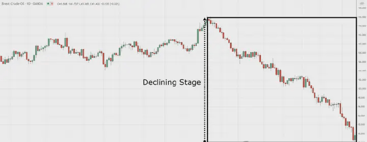 La fase di discesa è una tendenza al ribasso, composta da una serie di massimi decrescenti e minimi crescenti. In questa fase, la maggior parte dei trader è in grado di identificare la tendenza e sta cercando opportunità di vendita, ecco un esempio.