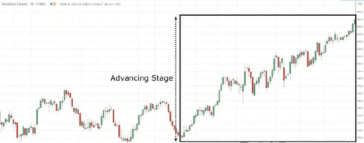 La fase di avanzamento è una tendenza al rialzo, composta da una serie di massimi crescenti e minimi decrescenti. In questa fase, la maggior parte dei trader è in grado di identificare la tendenza e sta cercando opportunità di acquisto; ecco un esempio.