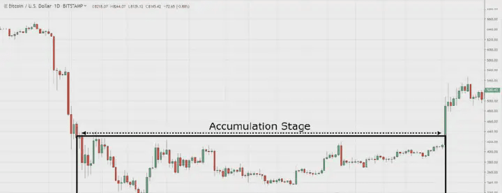 L'aspetto della fase di accumulo è simile a un mercato laterale, ma si trova in una tendenza al ribasso, come mostrato nell'immagine.