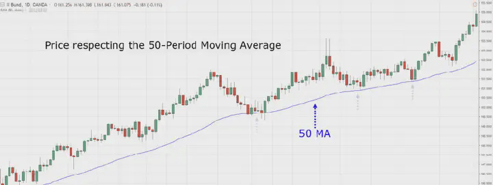 Le medie mobili sono indicatori che rappresentano la media storica dei prezzi sul grafico. In un mercato in tendenza, i prezzi possono seguire la media mobile poiché essa rivela potenziali pressioni di acquisto (o vendita), formando così un'area di valore; ecco un esempio.