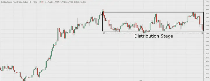 L'aspetto della fase di distribuzione è simile a un mercato laterale, ma si trova in una tendenza al rialzo, come mostrato nell'immagine.