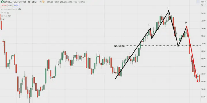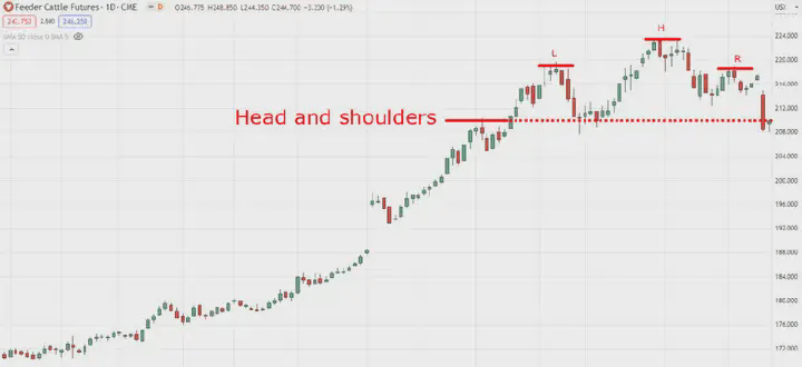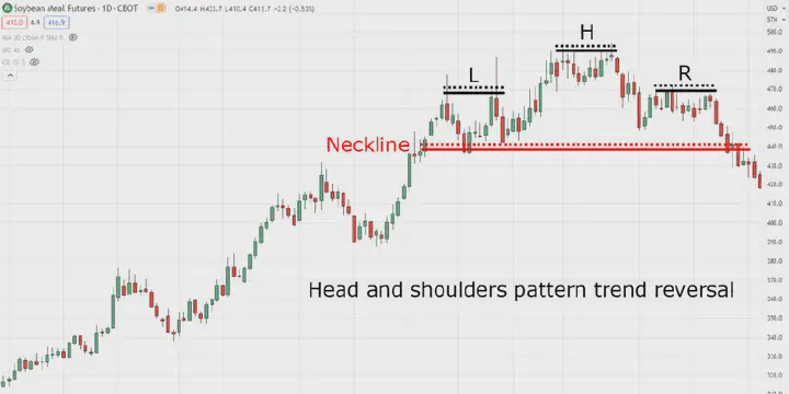 Questo è il momento in cui inizi a cercare quei modelli che indicano un'inversione di tendenza; per favore, rivedi quei modelli di inversione di tendenza che conosci, come il modello testa e spalle, il modello cupola e manico e il modello a doppio fondo. Nel caso attuale, ci concentreremo sul modello testa e spalle, come mostrato nella figura seguente.