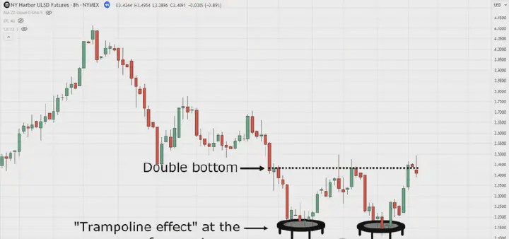 Questo modello può essere visto come un'espressione del mercato, cioè, ho toccato un punto minimo, ma ora sono pronto a lanciarmi per un forte rimbalzo, simile al principio di un trampolino, la forza acquirente non è stata schiacciata, come mostrato nella figura seguente.