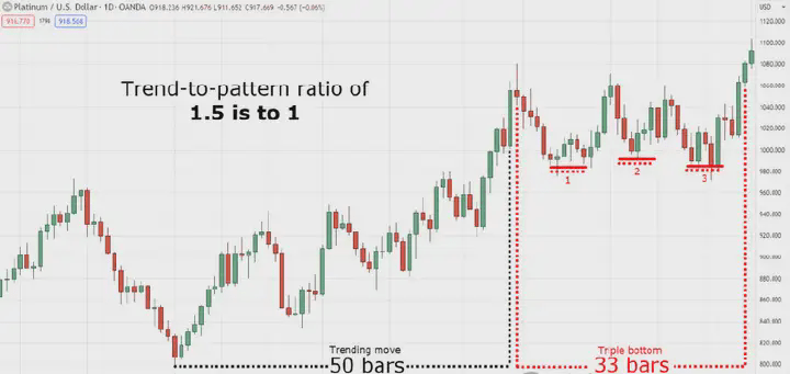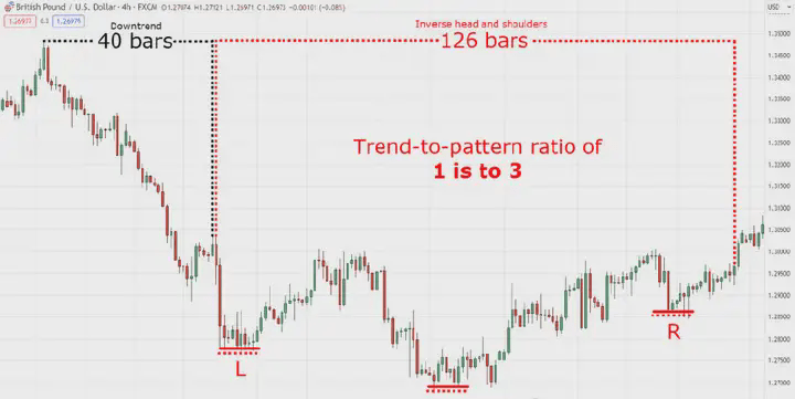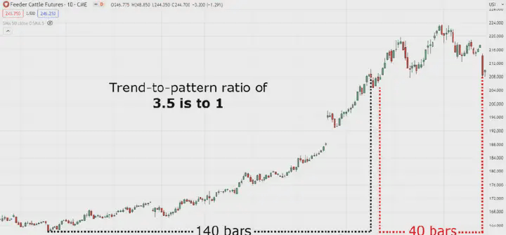Ad esempio, quando il rapporto tra tendenza e modello è 1:3, se osservi questo rapporto, allora il modello ha molte probabilità di innescare una nuova tendenza al rialzo, cioè l'inversione della tendenza. Potresti chiederti perché questi rapporti tra tendenze e modelli siano così importanti? Padroneggiando questo rapporto, avrai la capacità di prevedere le potenziali direzioni del mercato.