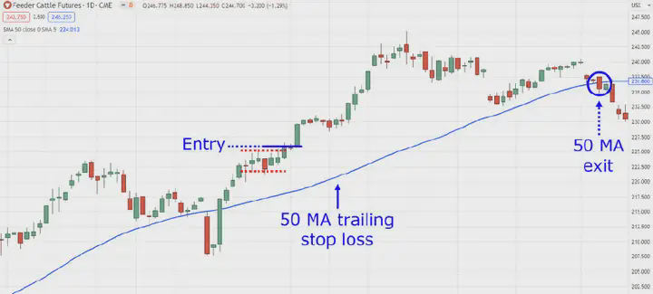 Per quanto riguarda il take profit, dovresti utilizzare trailing stop loss a medio termine, come la media mobile a 50 periodi, come mostrato nella figura seguente.