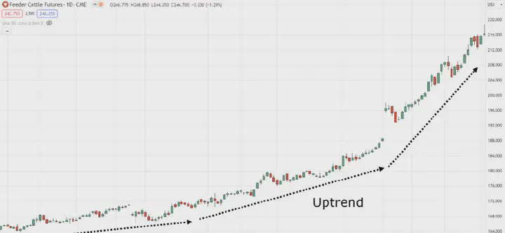 Tutto inizia con l'identificazione delle tendenze; devi analizzare attentamente i grafici per determinare se il mercato sta seguendo una tendenza al rialzo stabile o una tendenza al ribasso altalenante. In questo esempio, ci concentreremo sulla tendenza al rialzo esistente, come mostrato nella figura seguente.