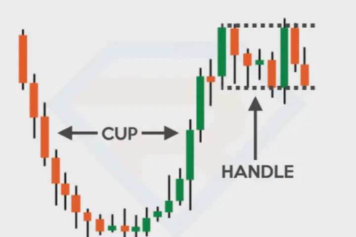 Il modello 'cupola e manico' è un modello di analisi tecnica che preannuncia una tendenza al rialzo del mercato, la cui struttura assomiglia a una tazza con un piccolo manico. Anche se il suo aspetto può sembrare amichevole, è uno dei modelli di trading più diretti e chiari. Perché? Perché il processo di trading di questo modello assomiglia a un'emozionante corsa sulle montagne russe, durante la quale gli investitori attraversano un periodo di discesa spaventosa, seguito da un aumento e da un periodo di stabilità, come mostrato nella figura seguente.