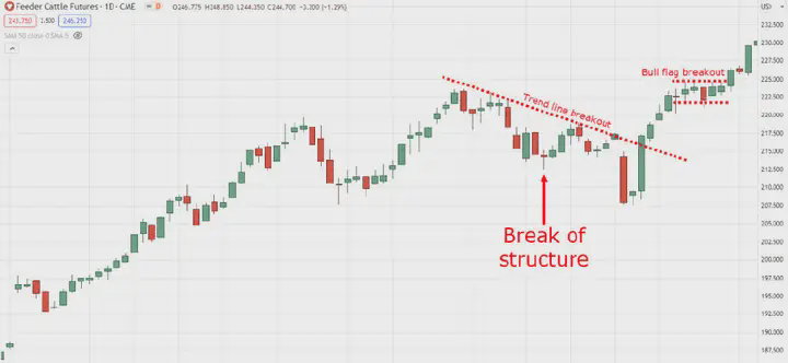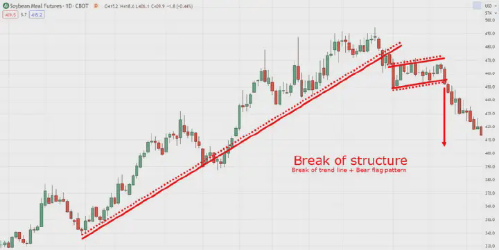 Immagina di aver costruito una casa con una fondazione solida, ma all'improvviso noti che i muri hanno subito uno spostamento, formando così una nuova struttura. Questo è precisamente il ritratto della rottura della struttura. Nel trading, quando il prezzo rompe la linea di tendenza stabilita, e successivamente forma una rottura del modello a bandiera, si verifica una situazione del genere, come mostrato nella figura seguente.