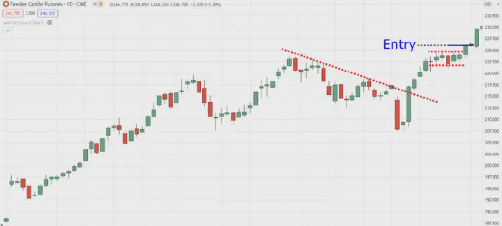 Inoltre, riguardo al modello a doppio fondo, attendere pazientemente che il recente massimo venga 'testato' o 'confermato' è una strategia molto utile. Ora puoi sfruttare appieno il potere della rottura della struttura pianificando con precisione il momento di ingresso, simile a catturare l'onda mentre inizia a muoversi, assicurandoti di poter cavalcare l'onda e massimizzare i tuoi profitti. Pertanto, quando il prezzo rompe il modello a bandiera, come mostrato nella figura seguente.