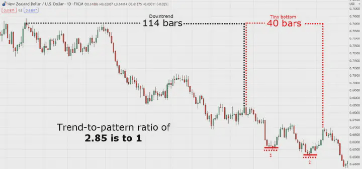 Pensi che questo modello di doppio fondo abbia abbastanza forza per invertire la tendenza? Non è così; è come se un formica tentasse di fermare un treno in corsa; il rapporto tra tendenza e modello è di 2.85:1. Pertanto, se il rapporto tra tendenza e modello supera 2:1 (cioè il numero di barre di prezzo in tendenza è almeno il triplo del numero di barre di prezzo nel modello), la tendenza dominante avrà probabilmente la meglio su questo modello relativamente piccolo.