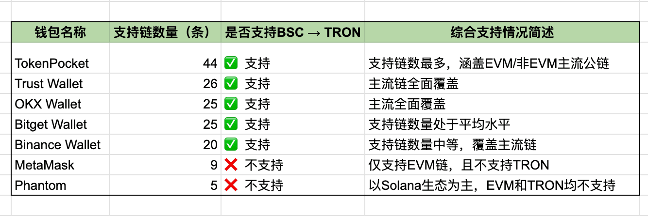 MetaMask e Phantom hanno capacità cross-chain limitate; MetaMask, sebbene supporti alcune catene EVM, non supporta TRON; Phantom si concentra principalmente su Solana, Ease, ed Ethereum, non è adatto per operazioni cross-chain con stablecoin.
