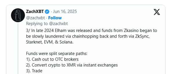 Dopo il rilascio di Nourzai alla fine del 2024, i fondi rubati hanno iniziato a muoversi attraverso una rete di riciclaggio sofisticata che impiegava il chain-hopping attraverso le reti ZkSync, Starknet, EVM e Solana.
