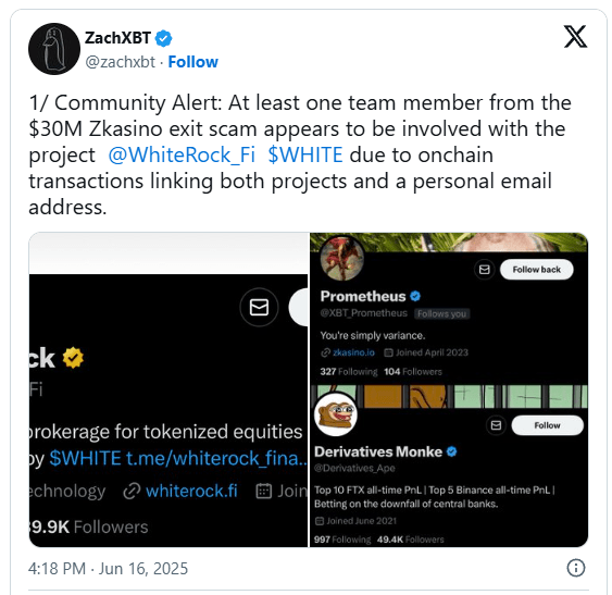 Il noto investigatore blockchain ZachXBT ha scoperto prove che collegano il progetto WhiteRock Finance allo scandaloso exit scam di ZKasino da 33 milioni di dollari, esponendo quello che sembra essere un'operazione di riciclaggio di denaro elaborata.